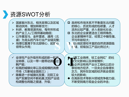 经过以上4p,对本土、本区域的产业资源的梳理,我们进行了一个简单的分析,分析我们的优势、劣势、机会和危险。在优势过程中,我们可以看到相关政策以及区域的联动扶持、转移支付,包括东北这些年牢固的一些教育资源、科研资源和每年形成的一个稳固的工人和工程师基础。我们可以从前段时间的一个疫情防护看到,我们东北派出了将近4000人的医疗队伍,服务于湖北。以华晨宝马等企业为龙头的汽车行业产业链完整,且地理位置比较突出。