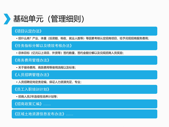 明确了一个组织之后,我们在基础单元就进行管理细则了,确定我们的一些项目认定办法,我们管理过程中的一些任务指标分解和绩效考核办法,这些只是我们的细则了。这里面我就不多做赘述,大家经验都很丰富,只是明确一下,希望有机会和南方的一些其他领域的伙伴们进行一个交流,大家一起来学习招商服务费用的一个兑现。