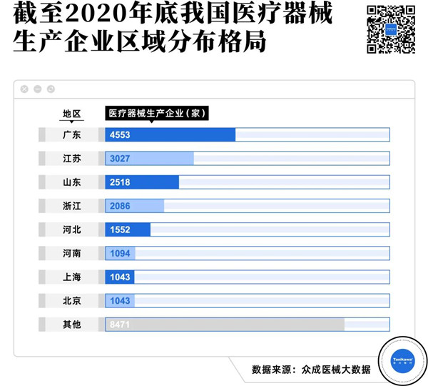 从区域分布来看,截至2020年底,广东共有医疗器械生产企业4553家,占据了全国各省市自治区最高的市场份额。江苏、山东、浙江紧随其后,已经逐渐形成了产业集聚优势。