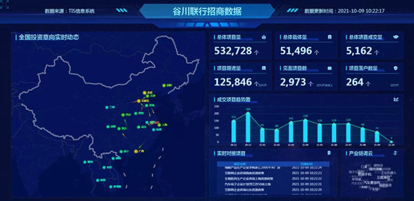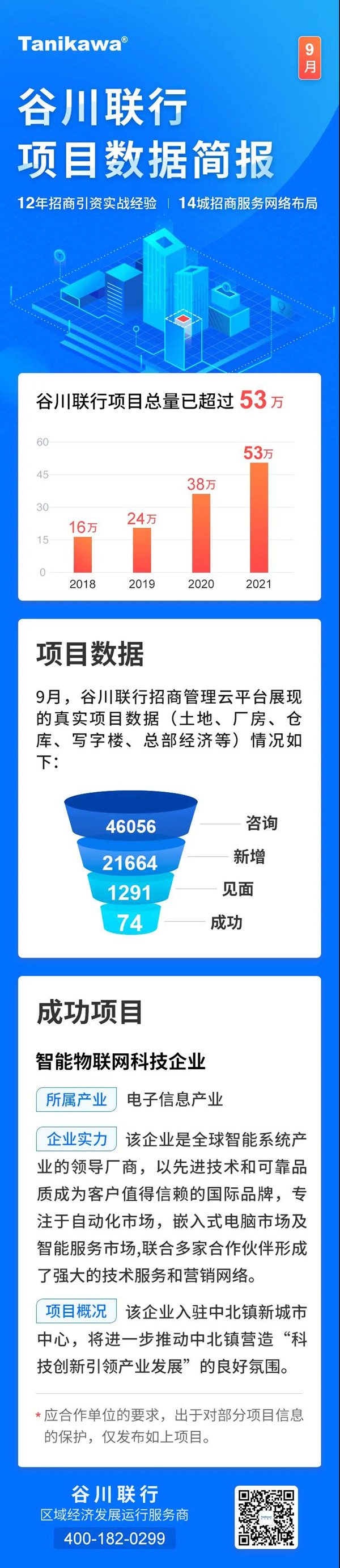 2021年9月,谷川联行招商引资全方位赋能,多点出击,捷报频传,实现项目咨询量46056个,新增项目21664个,见面项目1291个,成功项目74个。截止9月底,谷川联行项目总量已超过53万,日均有效项目700+。