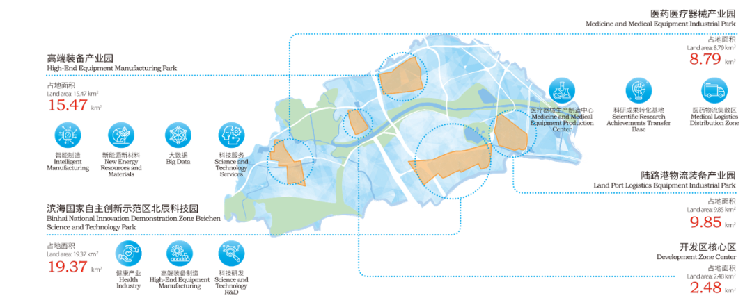 通过科学布局、打通企业上下游强链、补链,北辰经济技术开发区逐步形成高端高质高新化的现代产业体系。开发区内以高端装备制造、生物医药、新能源新材料、电子信息为四大主导优势产业,并且拥有自主制造中心以及科研中心,高新技术产值达80%以上。
