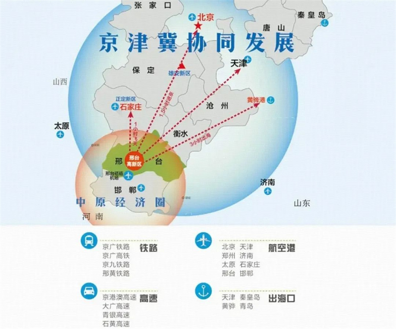 距离北京约380公里、雄安新区200公里,邢台成功融入北京2小时经济圈。再加上海陆空交通齐全,“半小时飞天、一小时进京、三小时出海”的格局也由此形成。