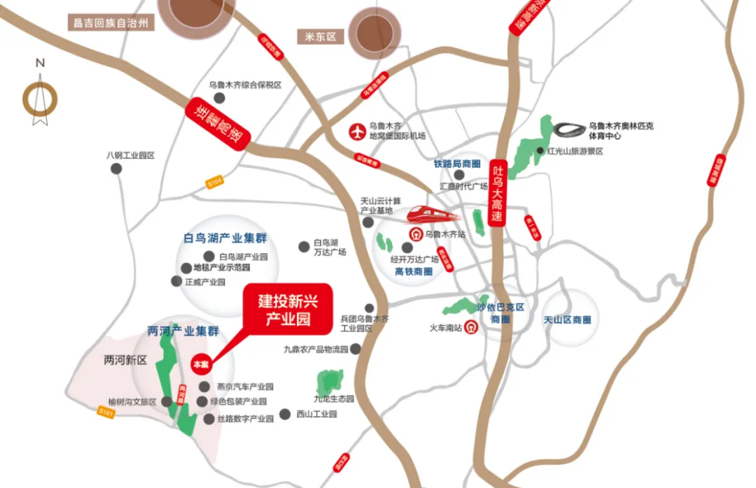 作为经开区(头屯河区)产业新星,两河片区新增长极,建投新兴产业园北接S105省道、南连S101省道,东部紧邻西绕城高速(预计今年年底建成),与乌鲁木齐市二环路相隔7公里,距地窝堡国际机场40公里,距乌北站10公里、乌西站12公里,客流、物流集散便利,交通位置优越。
