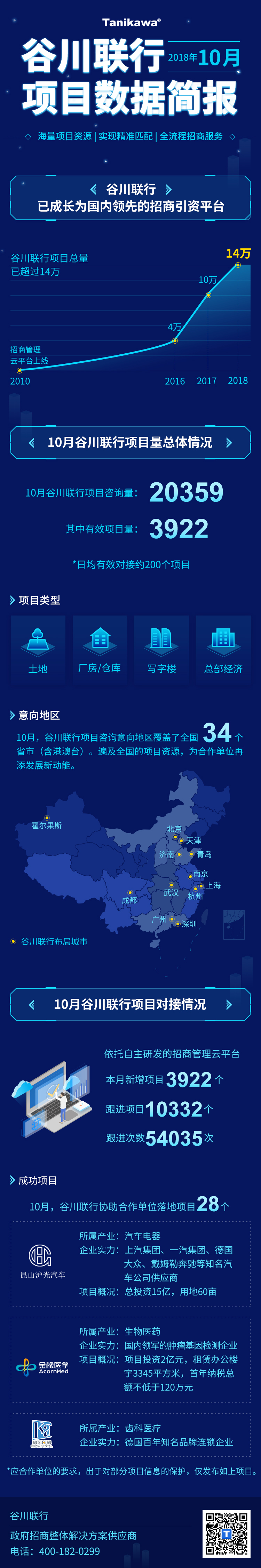 金秋十月,硕果累累。10月,谷川联行项目咨询量为20359个,其中有效项目量为3922个,日均有效对接约200个项目。更有沪光汽车、橡鑫生物科技、科瓦齿科等大项目落户,为区域经济发展再添新动力。