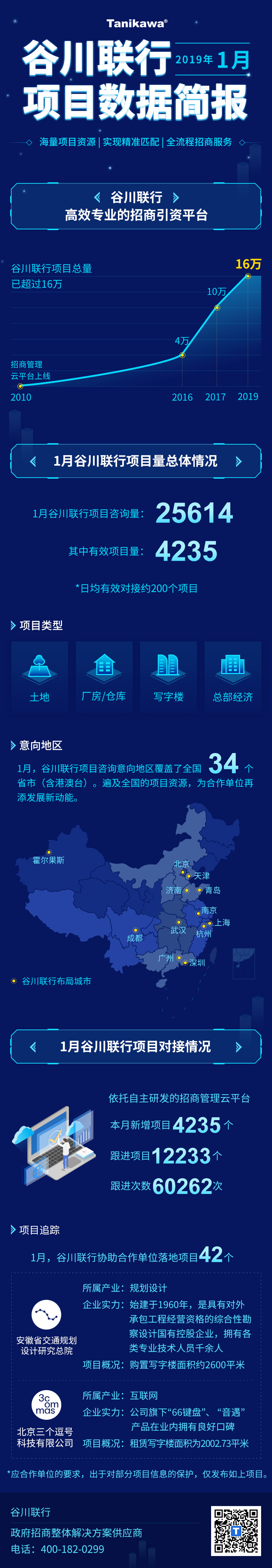 新年新气象,谷川联行新一轮项目招引热潮的大幕已经拉开。2019年1月,谷川联行项目咨询量为25614个,其中有效项目量为4235个,日均有效对接约200个项目。安徽省交通规划设计研究总院、北京三个逗号科技有限公司等优质项目的落户,全面助力区域产业链向高端攀升。
