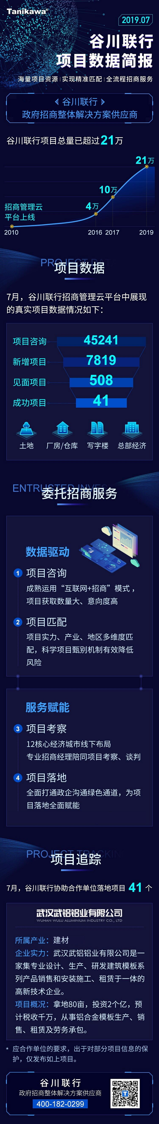 转眼2019年已经过半,在这个火热的七月里,谷川联行招商大数据也继续稳步上升:2019年7月,谷川联行项目咨询量为45241个,新增项目7819个,见面项目508个,成功项目41个。