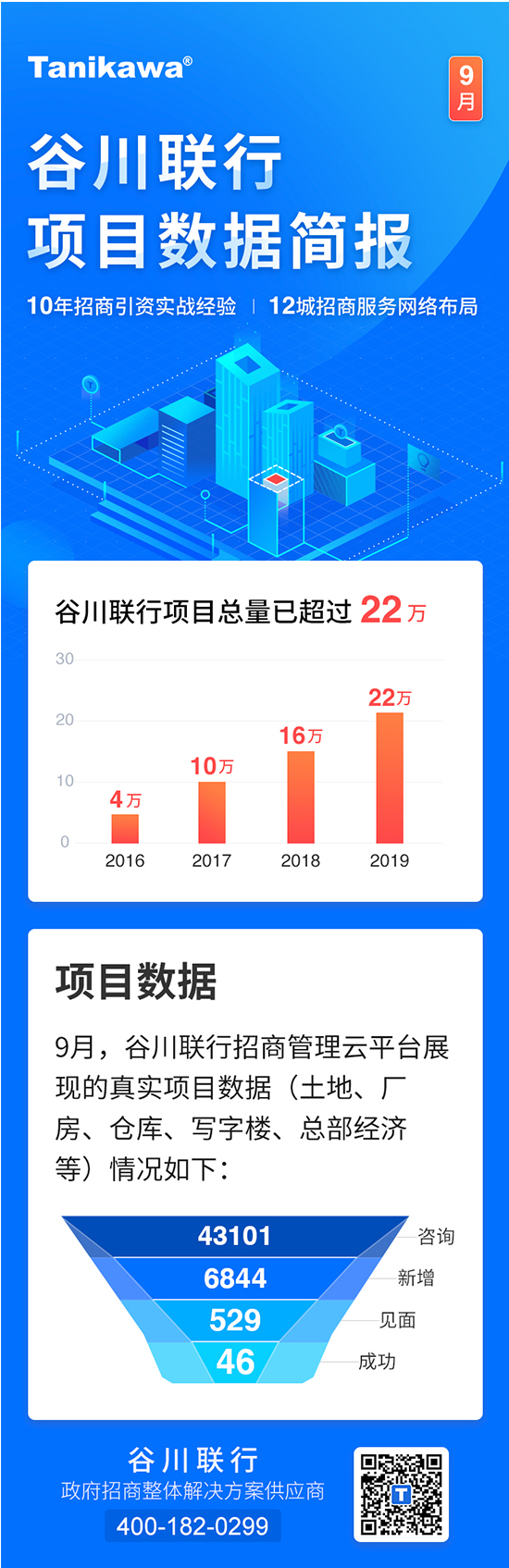转眼2019年前三个季度已经过去,第四个季度正式开始,在刚刚过去的9月里,谷川联行项目咨询量为43101个,新增项目6844个,见面项目529个,成功项目46个。“工欲善其事,必先利其器”,谷川联行始终坚持促进政企合作,强化政企良性互动,实实在在解决问题。