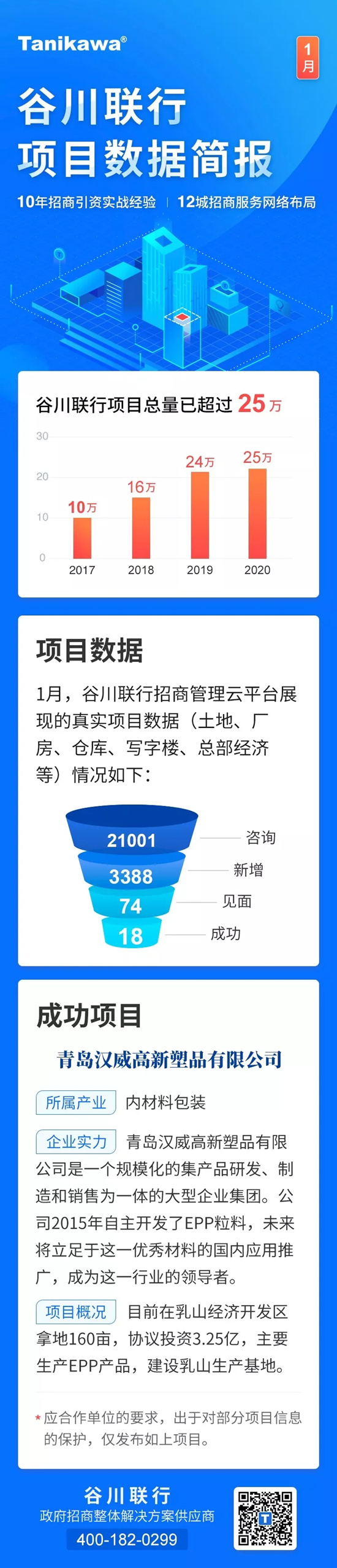 抗疫当下,谷川联行也没有停下招商引资的脚步,1月实现咨询项目21001个,新增项目 3388个,见面项目74个,成功项目18个。站在2020新的起跑线上,谷川联行将继续发挥“互联网+”招商引资模式的优势,提供招商上“云”全流程解决方案,助力政府园区顺应招商引资发展新趋势。