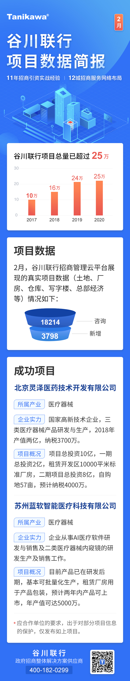 2月,谷川联行战“疫”助招商,实现项目咨询量18214个,新增项目3798个,其中灵泽医药、蓝软智能等项目成功落地充分体现了疫情期间谷川联行“互联网+”招商引资模式的优势。未来,谷川联行将继续提供招商上“云”全流程解决方案,助力政府园区顺应招商引资发展新趋势。